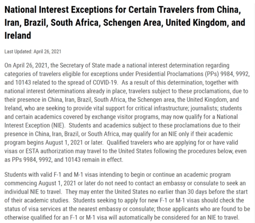 今天(2021年4月26日),美国国务院突然发布公告宣布:来自中国、伊朗、巴西、南非、申根地区、英国及爱尔兰的F-1和M-1签证持有者可以直接获得国家利益例外NIE《National Interest Exceptions for Certain Travelers from China, Iran, Brazil, South Africa, Schengen Area, United Kingdom, and Ireland》,因而可以从各国直飞美国。全文如下: